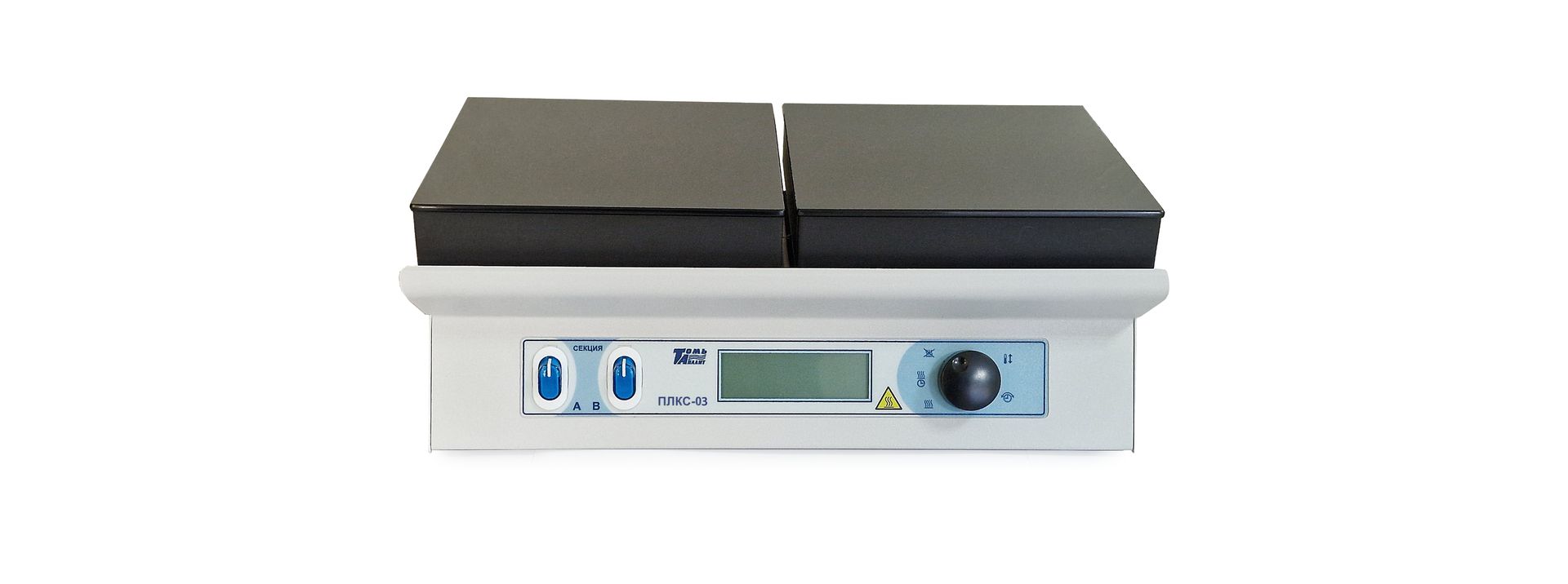- Плита ПЛКС-03 имеет две секции нагрева, что позволяет эффективно использовать нагревательную поверхность. Каждая секция нагрева может работать отдельно или совместно.